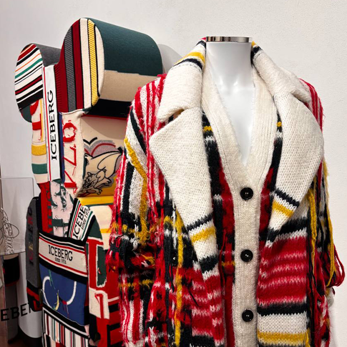 This exhibition has brought together garments, footwear, sketches, textile samples, colour charts, editorial materials, videos, immersive technologies and archival documents from various historic brands. Among them, the knitwear experimentation of Iceberg, founded with the Gilmar Group, is presented through looks, original sketches and various photographs that demonstrate a dialogue with art and graphic language.